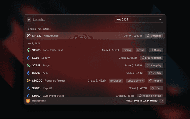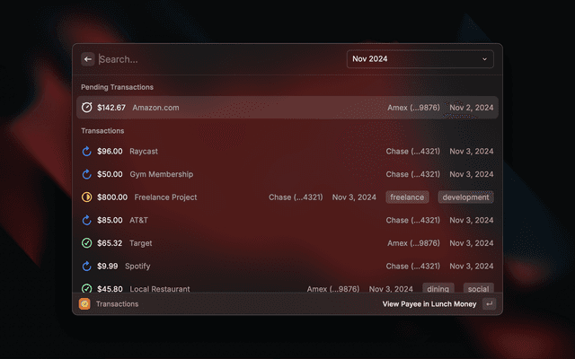 Raycast extension to view and update your Lunch Money transactions.