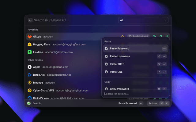 Search entries ⸱ Copy & paste any field ⸱ Generate TOTP codes ⸱ Mark entries as favorites