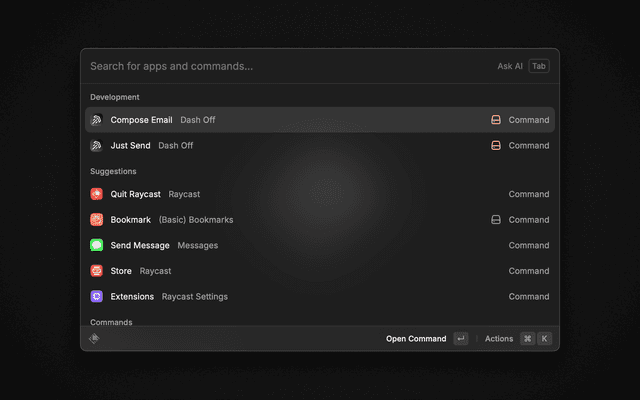 Just Send: This command will use your text selection as the body of the email and send it to the default recipients in the Extensions Preferences, using the default subject line.