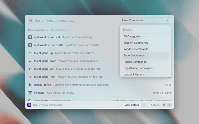A searchable, categorized cheatsheet for tmux commands. Find any command instantly, see your custom keybindings, and paste directly into the terminal.