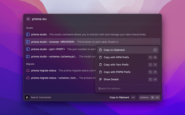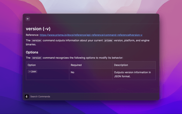 Quickly search and use Prisma CLI Commands along with command details.