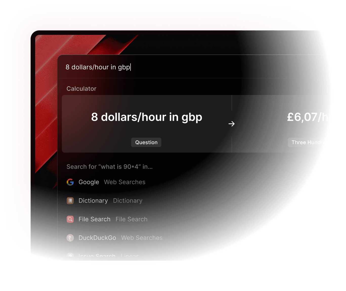 Raycast solves your complex math expressions and supports time zones, unit conversions, dates, and currency – including crypto. The best thing is, it understands your natural language!