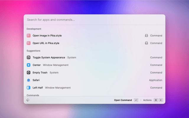 pika in RaycastOpen URL in Pika and Open Image in PikaOpen Image in Pika: You can select an image using Cmd+O from your system and open directly in PikaOpen URL in Pika: You can enter a website URL or image URL and open in PikaPlease email hi@pika.style for bug reporting or feedback