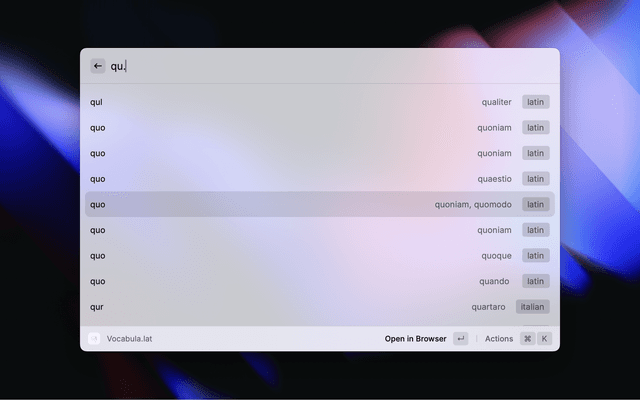 You can search for words the same way you would on the website. The extension will return all results, which sometimes might be a bit confusing as there are different entries for the same word.