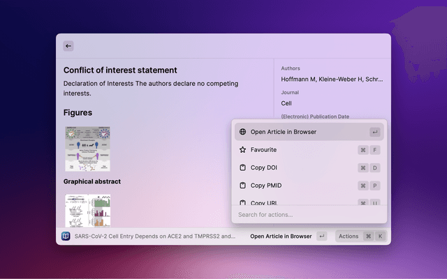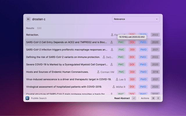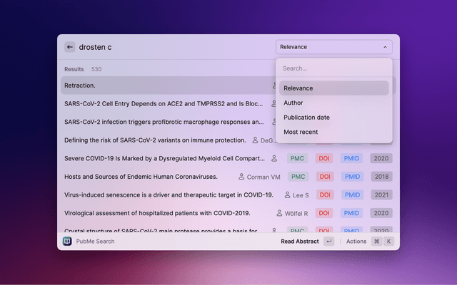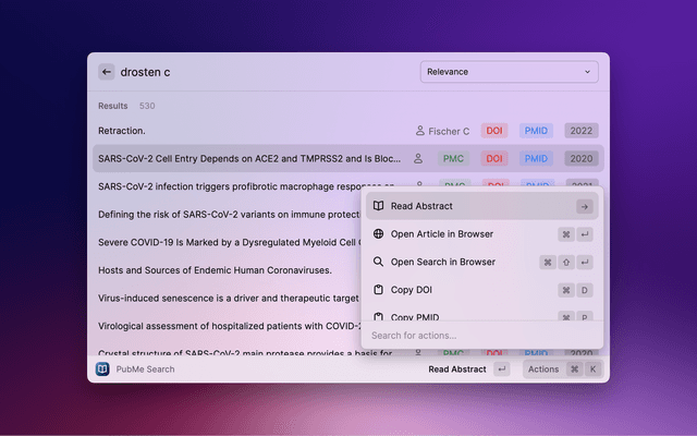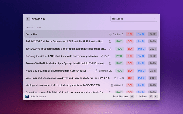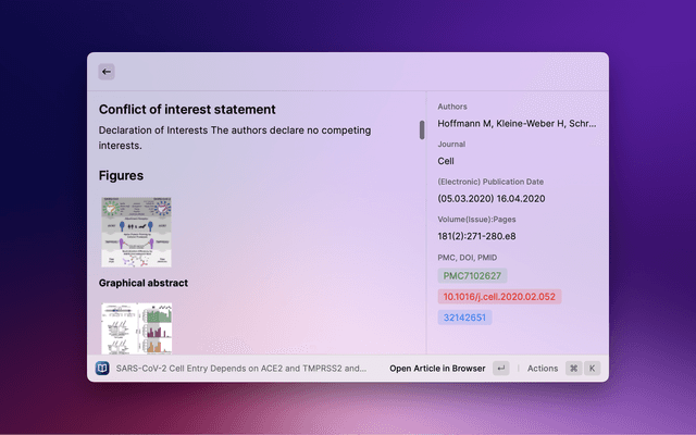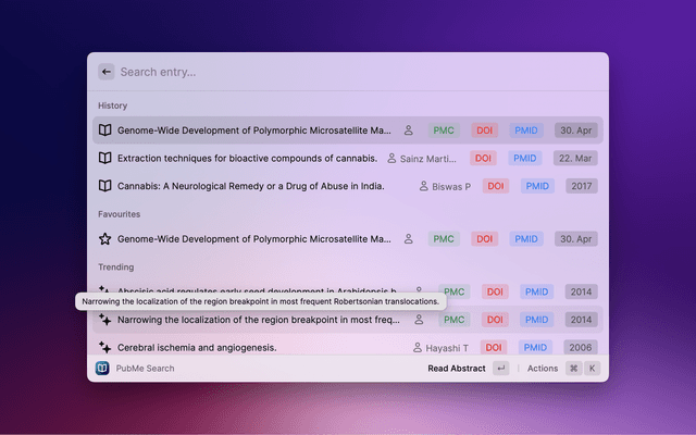 Search PubMed, a free database maintained by the National Library of Medicine (NLM), with Raycast. If the search entry is empty, 10 Trending Articles (from https://pubmed.ncbi.nlm.nih.gov/trending/) are displayed and cached. You can set the refreshInterval in settings.