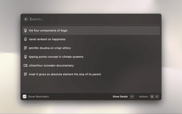 Simply add any knowledge that you don't want to forget – insights from articles, facts, concepts, arguments – and Recap does the rest. It uses AI to process your inputs and sends personalized email reminders using spaced repetition to maximize long-term retention.