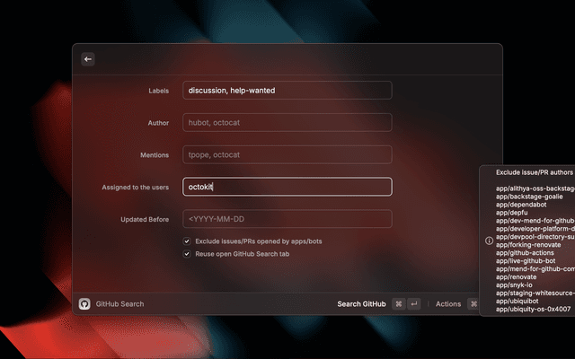 Work with issues, pull requests, manage workflows, search repositories and stay on top of notifications