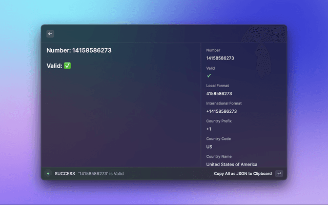 This is a Raycast extension for Number Verification API by APILayer. With this extension you can perform lookup for a total of 232 countries around the world and verify the validity of phone numbers.
