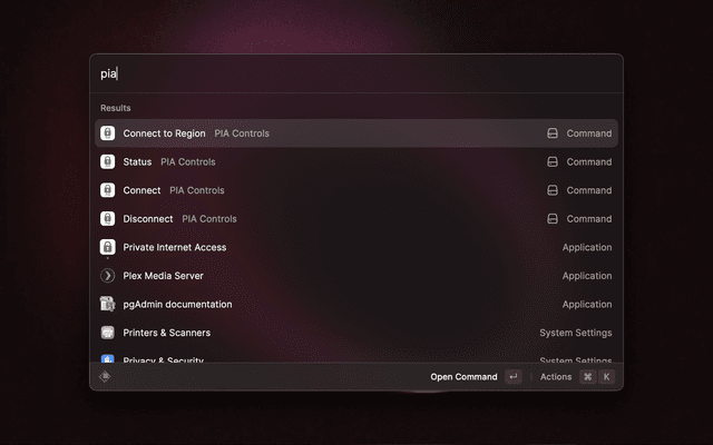 PIA Controls is a simple extension that allows you to control your Private Internet Access VPN connection from within Raycast. Ensure you have Private Internet Access installed.