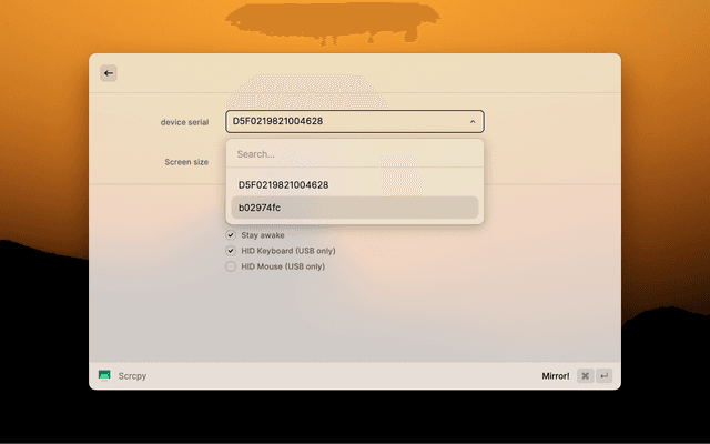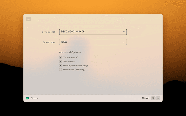 Everything from scrcpy with neat GUI provided by Raycast! Plug in your android phone and start mirror with one click.